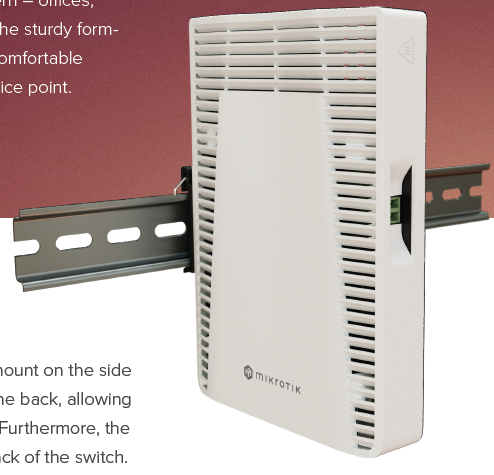 CRS304-4XG-IN 包括侧面的DIN导轨安装和背面的标准螺钉附着点,允许在任何地方无缝安装。此外,侧面DIN导轨安装可以移动到交换机的背部。