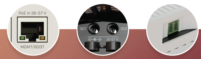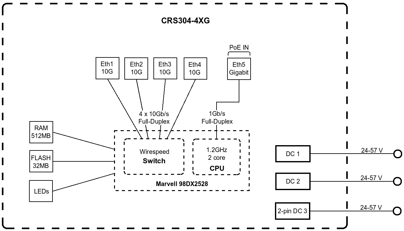 电源冗余是CRS304的最大的特点,它提供四种不同的电源输入方式:两个直流插孔,一个2针端子和PoE-in。交换机自动选择电压最高的电源输入,保证不间断运行。