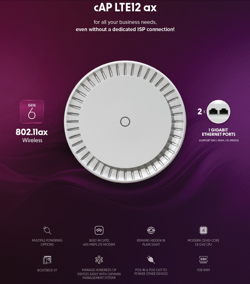 cAP LTE12 ax 远不止简单的AP接入点,配备了强大的1.8 GHz四核ARM处理器和1 GB RAM,以及极具灵活性的RouterOS v7。它提供了一系列高级功能,包括复杂的防火墙规则、IPsec硬件加密、Wireguard支持、高级路由、多种隧道用于远程工作或文件共享,甚至支持轻量级BGP功能!这使得它成为需要在各种环境中提供安全、高性能移动连接的企业的理想解决方案。