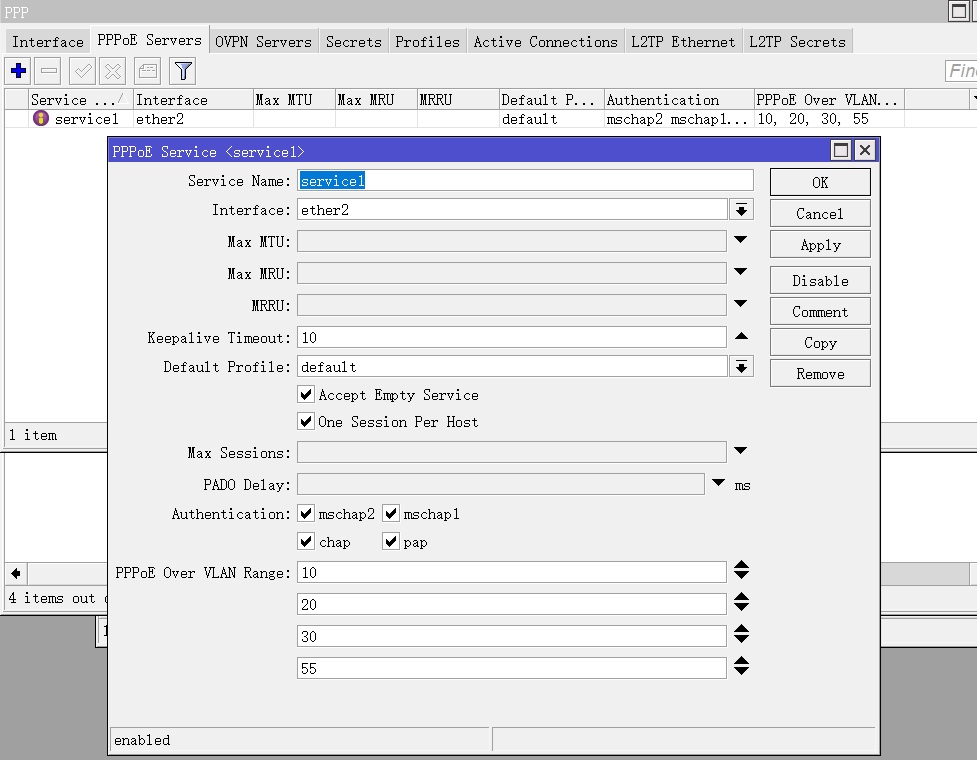 pppoe-over-vlan-range=10,20,30,55 service-name=service1