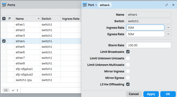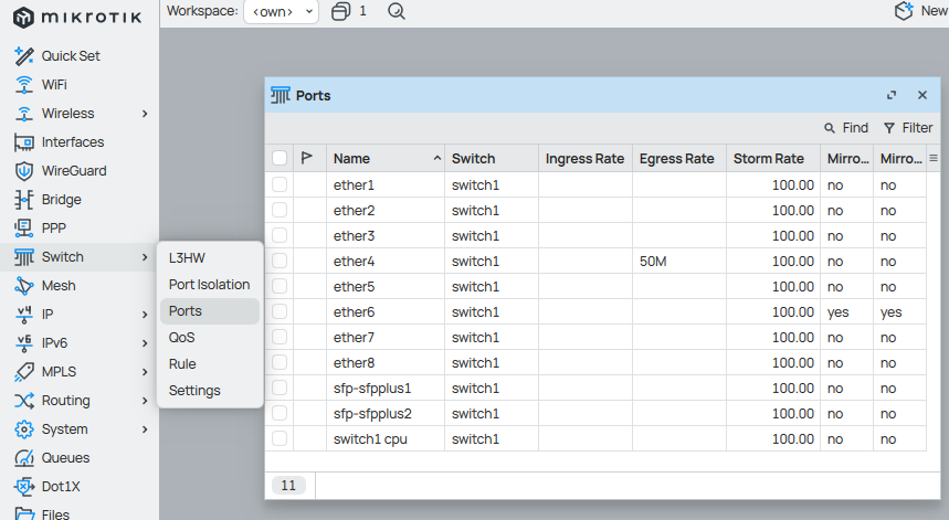 当使用RB/CRS/CCR系列有交换芯片的设备时,可以使用交换芯片来控制某个端口的带宽速率,这个操作是在switch port下,如下图:
