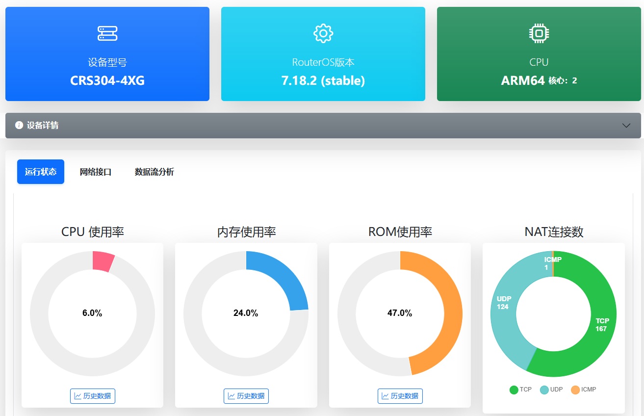 Shallow RouterOS API是基于RouterOS的API接口搭建的一个监控管理平台,主要用于本地网络的RouterOS设备管理,目前具备实时监控功能,其他功能还在开发中... 由于个人的开发经验非常的浅薄,所以使用shallow这个名称来定义项目! 建议: 1、API对接主要适配RouterOS v7,兼容v7.18+以上版本; 2、在RouterOS的container运行,已经测试在基于RouterOS v7.17+的hAP ax3,RB5009,RB450x4,CHR,x86等硬件,当然也可以通过docker import命令导入在Linux运行; 3、在RouterOS的RB、CRS和CCR设备运行时,API获取数据CPU消耗较低,主要是前端页面刷新时CPU消耗较高,如RB450x4(IPQ-4019 arm32 4核心)在刷新页面时CPU消耗在40%左右,只是在停留在仪表盘或设备状态观察数据CPU消耗在7-10%左右。详细介绍参见