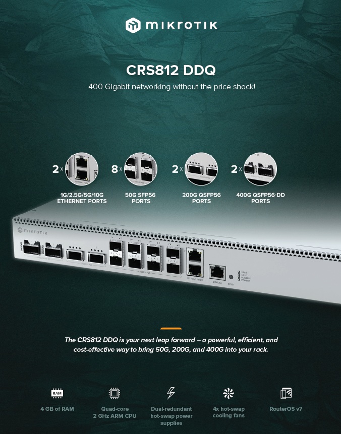 MikroTik宣传内容:400G交换机曾意味着昂贵、遥不可及,但CRS812 DDQ彻底改写了这一认知! 搭载现代Marvell交换芯片与高性能ARM处理器,传承了RouterOS数百万部署案例信赖的,更首次实现高达400 Gbps的端口传输速率。