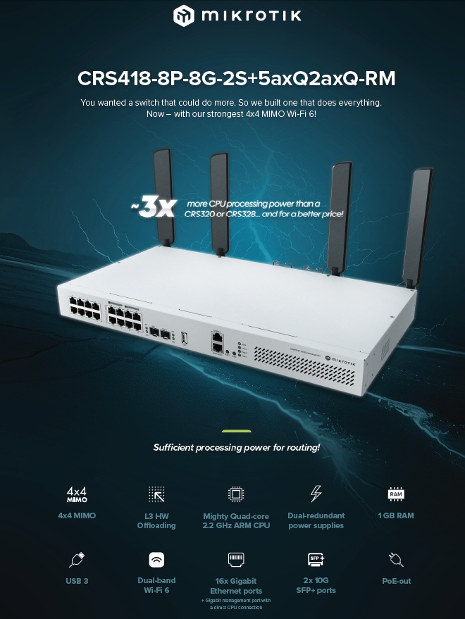 对于希望用智能多任务设备取代杂乱设备集群的用户而言,这是真正的升级之选——专为真实路由负载、高带宽上行链路和整洁线缆管理而设计。无论是为AP和监控摄像头供电、连接多台现代工作站组建高速NAS系统,甚至运行Docker,还是管理中型办公室的路由任务,CRS418都能轻松胜任——并且保持极致性价比!