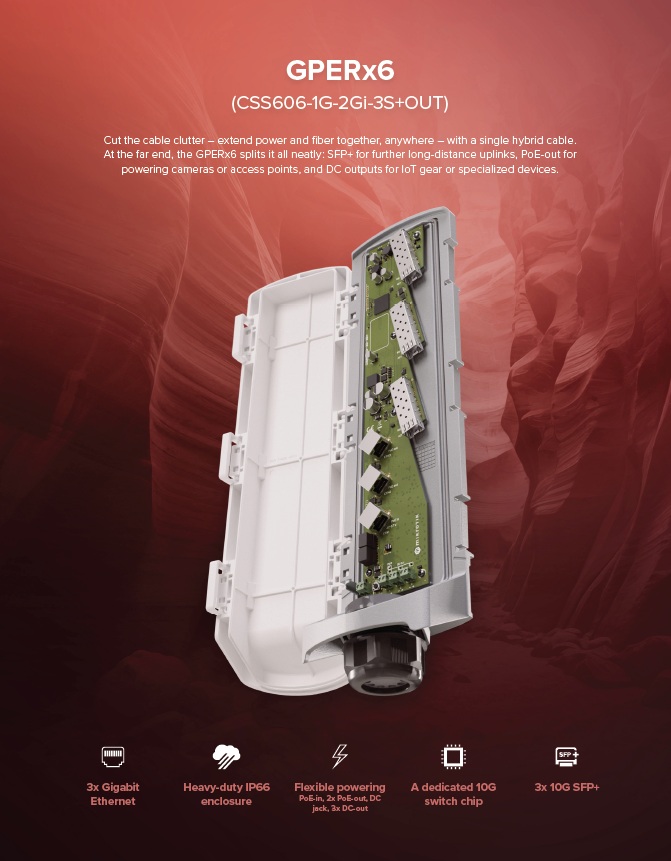 GPERx6(CSS606-1G-2Gi-3S+OUT)是一款万兆光电混合交换机,通过以太网的铜线为设备提供PoE供电,使用10G SFP+光信号作为数据载体,为远端提供供电和高速网络连接