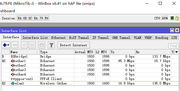 下面是hAP lite的bridge1未启用IGMP Snooping,CPU为68%