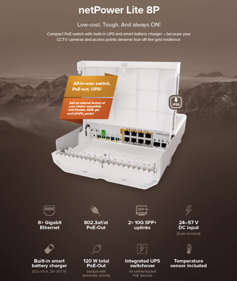 netPower Lite 8P 内置 UPS 和智能充电器,可以与外接 24V 电池协同工作——甚至能从低压直流电源输出高电压 PoE,使 netPower 成为 CCTV、办公场所、公寓楼以及智慧城市部署的理想选择。 netPower Lite 8P 配备8个 802.3af/at PoE-Out 的千兆以太网端口,以及两个 10G SFP+ 光口。它运行 SwOS Lite 系统,非RouterOS系统。电源输入也非常灵活:只需通过 2-pin 接口输入 24–57V DC。 其工作温度范围为 –40°C 到 +70°C,在许多设备已无法正常运作的环境中依然能稳定运行。整机功耗最高可达 181W,其中 PoE 输出为 120W。当供电输入不足时,PoE 会自动优先供电,以确保关键设备保持在线。
