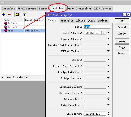 配置一、开启RouterOS的PPTP服务,并创建一个新的profile规则