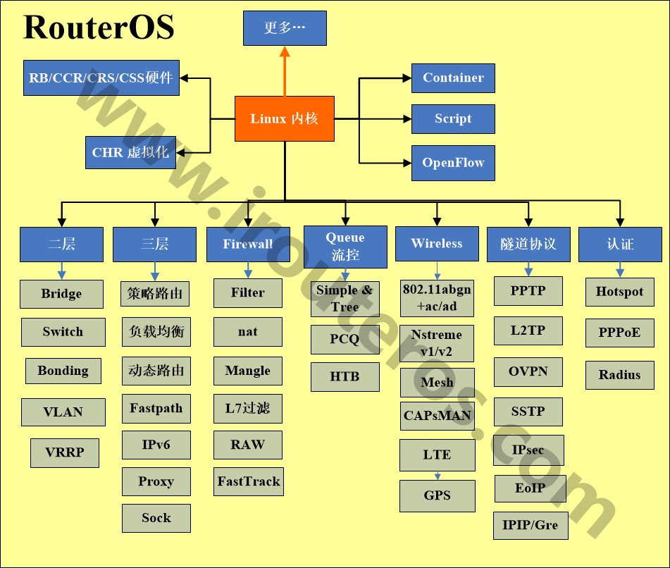 - 兼容x86平台的硬件,如Intel和AMD等,开发了基于MIPS、PowerPC、ARM和Tile等平台的RouterBOARD、CRS和CCR系列,还开发了基于虚拟化的CHR平台。
