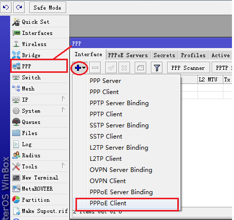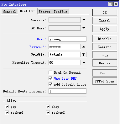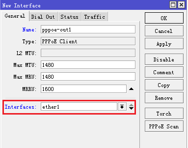 PPPoE-client创建后取名pppoe-out1,选择拨号的interface物理接口,如:ether1