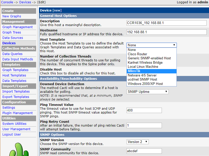 Cacti中进入device 菜单,下点击add添加设备,设置主机名称,IP地址,模板、SNMP版本和团体名: