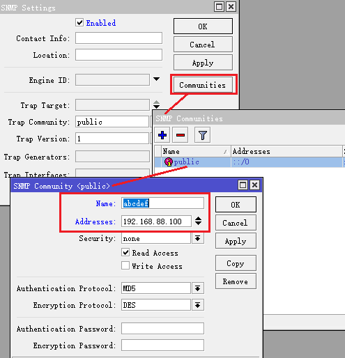 首先我们需要配置团体名规则,首先进入snmp communit,添加Cacti主机IP,仅允许192.168.88.100访问snmp,设置团体名abcdef