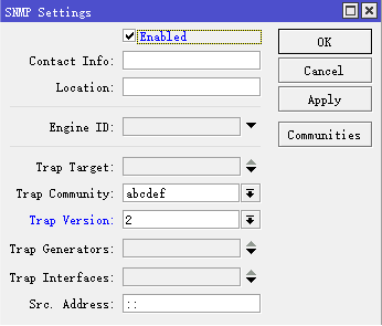 [admin@MikroTik] /snmp> set enabled=yes trap-community=abcdef trap-version=2