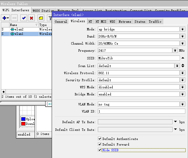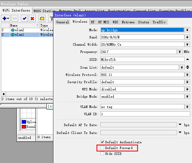 分类:Wireless 发布于 2019-03-05 16:14:58 +0800 CST RouterOS在做无线覆盖时,如何隐藏SSID和隔离WiFi客户端用户之间通讯的设备如下: 隐藏SSID,打开wlan1的配置,选择wireless菜单,选择Hide SSID 隔离WiFi客户端之间的通讯,打开wlan1的配置,选择wireless菜单,取消Default Forward选项 打赏支持 喜欢 (0) 不喜欢 (0) 微信 支付宝