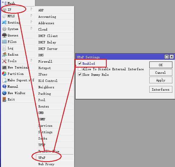 MikroTik RouterOS支持即插即用(Universal Plug and Play),通用即插即用 (UPnP) 是一种用于 PC 计算机、智能设备和其他网络设备的常见对等网络连接的体系结构,即建立透明的点对点网络连接。