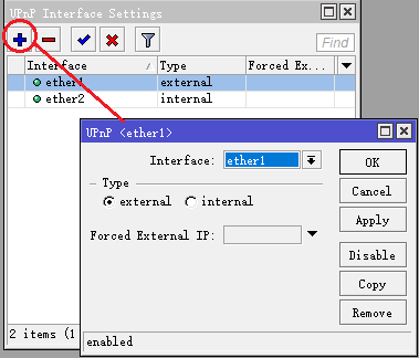 [admin@MikroTik] ip upnp interfaces> add interface=ether1 type=external