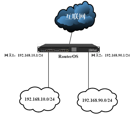 RouterOS内网有192.168.10.0/24和192.168.90.0/24两个网段,网关都配置在RouterOS内口ether2和ether3,IP地址配置: