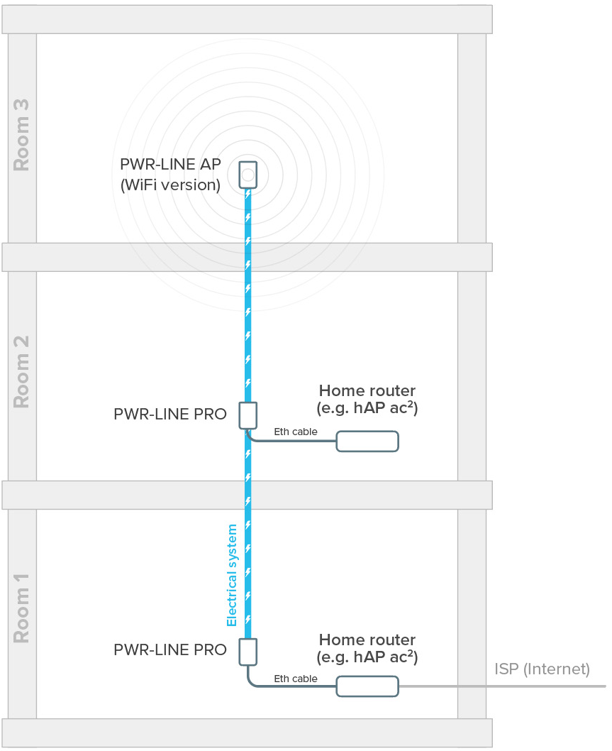 PWR-LINE PRO提供一个千兆以太网接口,用于接入其他网络设备,如无线AP路由器或其他网络设备,通在一个电力系统下的电线将网络无缝连接在一起,而且在一个电力系统中,支持多大8台PWR-LINE组网。