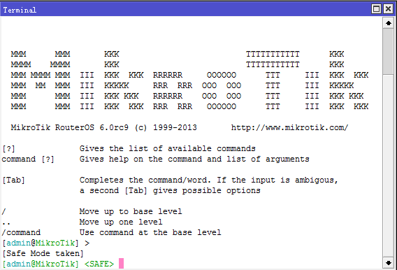 现在,如果telnet连接或者winbox连接中断,这时连接超时9分钟后,所有在Safe模式下的配置修改将会被自动解除。退出Safe模式可以使用 [Ctrl]+[D]