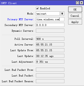 对于RouterOS设置ntp客户端来说是非常有必要的,特别是RouterBOARD设备,RouterBOARD不像x86设备,主板都带有BIOS电池,能保持时间和信息,由于RouterBOARD设备不含电池,即断电后BIOS时间将无法持续运行,只能清空,所以通过ntp客户端能在开机器通过网络连接到同步当前时间。