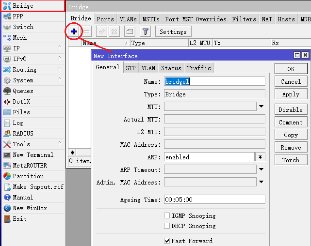 配置wlan1无线网卡和ether2-ether5加入bridge,创建bridge的目的是将ether2到ether5这4个网口变为二层交换端口,实现交换机的功能。在winbox然后进入bridge菜单,创建bridge1接口