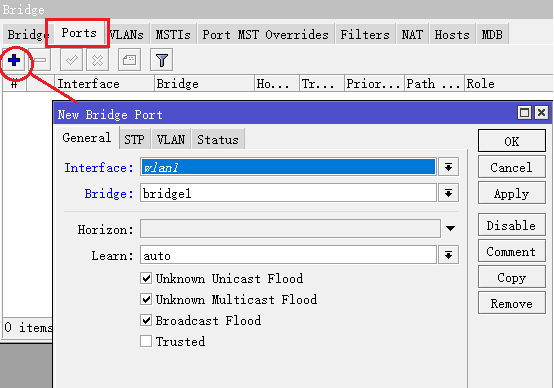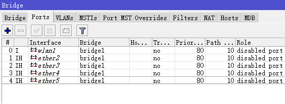 在bridge菜单下,打开ports,将wlan1和ether2-ether5,5个网口加入到bridge1,下图是wlan1口加入bridge1