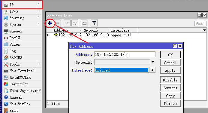 进入ip address给bridge1配置IP地址192.168.100.1/24,这样接入wlan1和ether2-ether5,都使用相同网关192.168.100.1