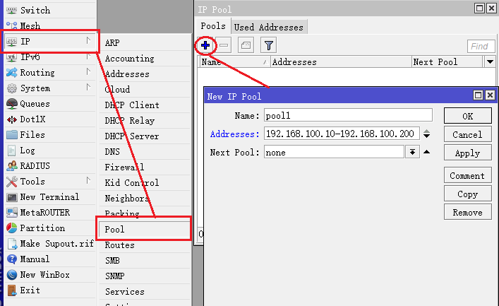 首先定义地址池pool,进入ip pool中添加分配给用户的地址段范围192.168.100.2-192.168.100.200