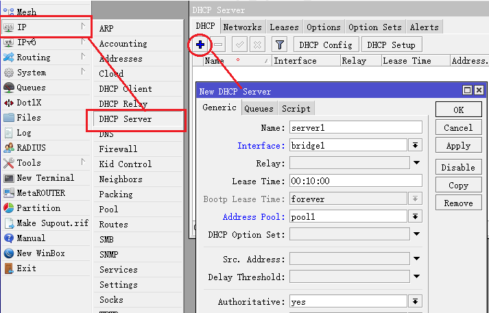 进入ip dhcp-server建立DHCP服务,选择我们刚才配置的pool1地址池