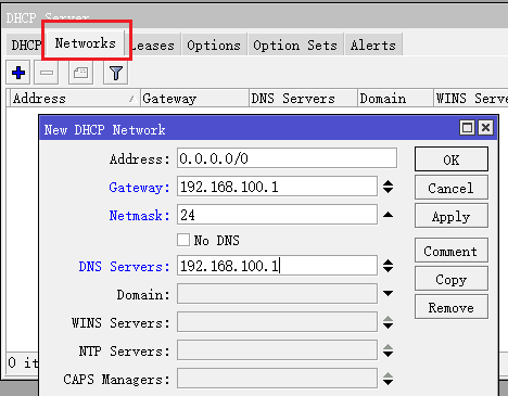进入network选项,新建一条规则分配给用户的的网关、子网掩码和DNS,这里我们启用了DNS缓存,直接使用网关作为用户DNS