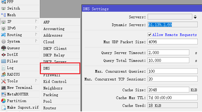 进入IP DNS菜单,配置DNS缓存,如果PPPoE拨号,配置了use-peer-dns,拨号成功后,会自动将运营商DNS添加到DNS下,然后选择allow-remote-request启用DNS缓存,即内网用户可以使用192.168.100.1作为DNS服务器。