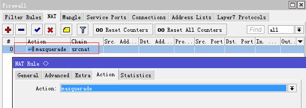进入ip firewall nat,添加一条srcnat规则,默认设置action为masquerade,转换内网IP 192.168.100.0/24到WAN口的IP,代理上网