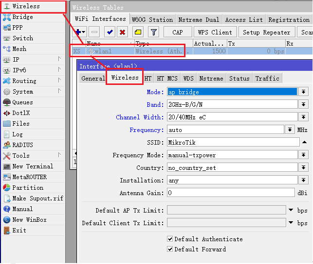 配置无线网卡,进入Wireless菜单,可以看到无线配置列表,里面有一张wlan1无线网卡,打开后进入wireless项: