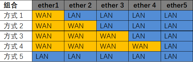 假如是一台5网口到RouterOS路由器,网口可以认为是独立的,WAN和LAN组合方式可以这样(可能对缺乏基础到朋友看着有点困惑,有兴趣可以自己多了解和实践,慢慢就会明白):