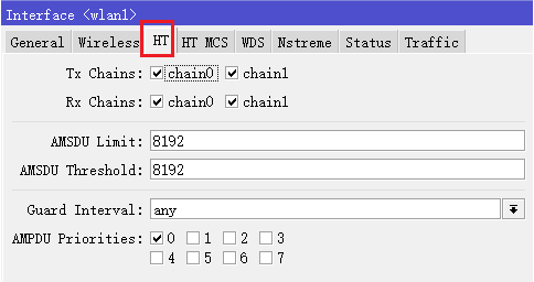 RouterOS可以调整MIMO配置,在HT菜单下,对应的Tx/Rx参数chain0和chain1,即采用MIMO是1x1,还是2x2模式(也可以配置2x1,或者1x2),下图chain0和chain1全选代表2x2 MIMO