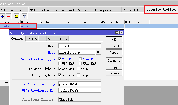 进入security profiles菜单,选择default规则,设置mode为dynamic keys,勾选WAP PSK和WPA2 PSK,并设置密码为yus12345678
