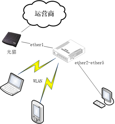 通过RB951Ui-2HnD为例,RB951Ui-2HnD是5个以太网接口(ether1支持PoE输入,ether5支持PoE输出),支持802.11bgn无线。家庭宽带通过运营商光猫连接,配置PPPoE拨号上网,通过一个802.11bgn的无线网卡覆盖,如下图:
