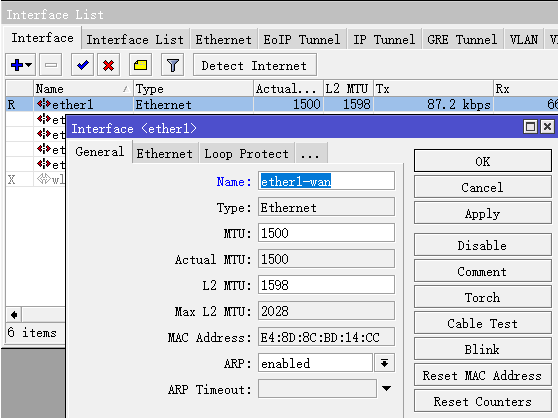 为了区分接口,将ether1配置为外网接入,并取名为ether1-wan