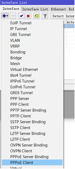 在interface菜单添加点击“加号”图标,添加pppoe-client