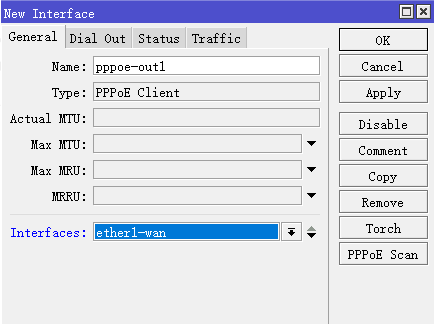 选择后,会创建pppoe-out1的配置接口,选择interface=ether1-wan,其他参数默认