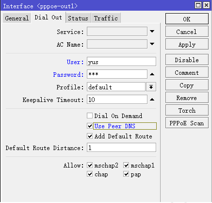 选择Dial-out菜单,设置账号yus和密码yus,即user和password,选择Add default router添加默认路由,记住user peer DNS要选择上,该参数是使用对端分配的DNS