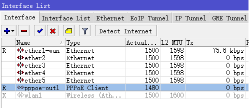 这样pppoe拨号设置完成,当连接上光猫后,RouterOS会自动拨号, pppoe-out1接口前面会显示“R”代表拨号成功,并获取IP地址和DNS