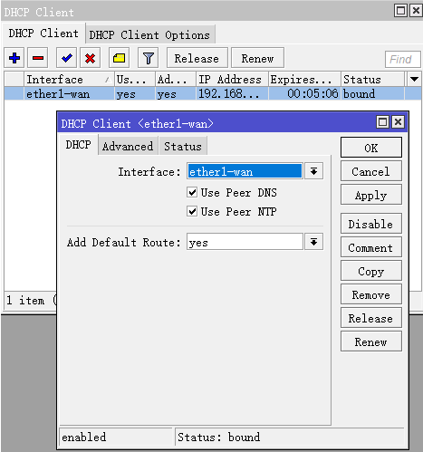 注意:如果你的光猫不是桥接模式,由光猫拨号代理上网,可以不用设置PPPoE拨号,而选择在ip dhcp-client下添加一个DHCP客户端,自动获取IP地址,这样操作更简单