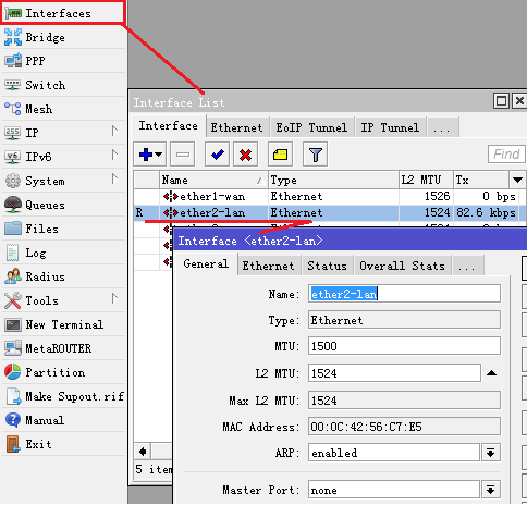 在/interfaces列表中修改ether1为ether1-wan,定义为外网接口;修改ether2为ether2-lan定义为内网接口,如图: