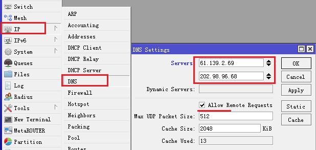 在/ip dns的settings中添加多个DNS服务器地址,根据需要启用DNS缓存(allow remote requests),并能通过Cache size修改DNS缓存大小: