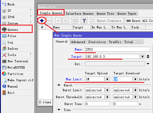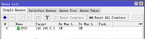 进入Queue添加带宽控制规则,选择simple queue,添加主机IP是192.168.0.3,并取名为IP03,设置带宽为上行(upload)1m,下行(download)2m