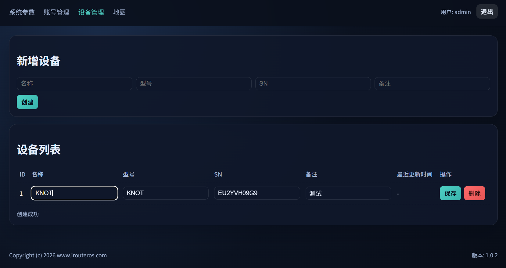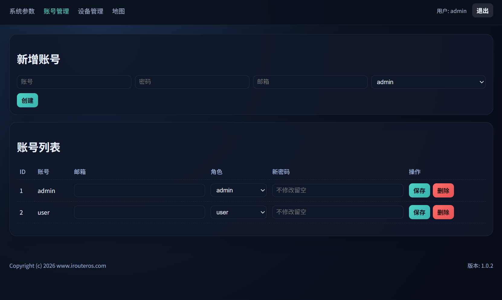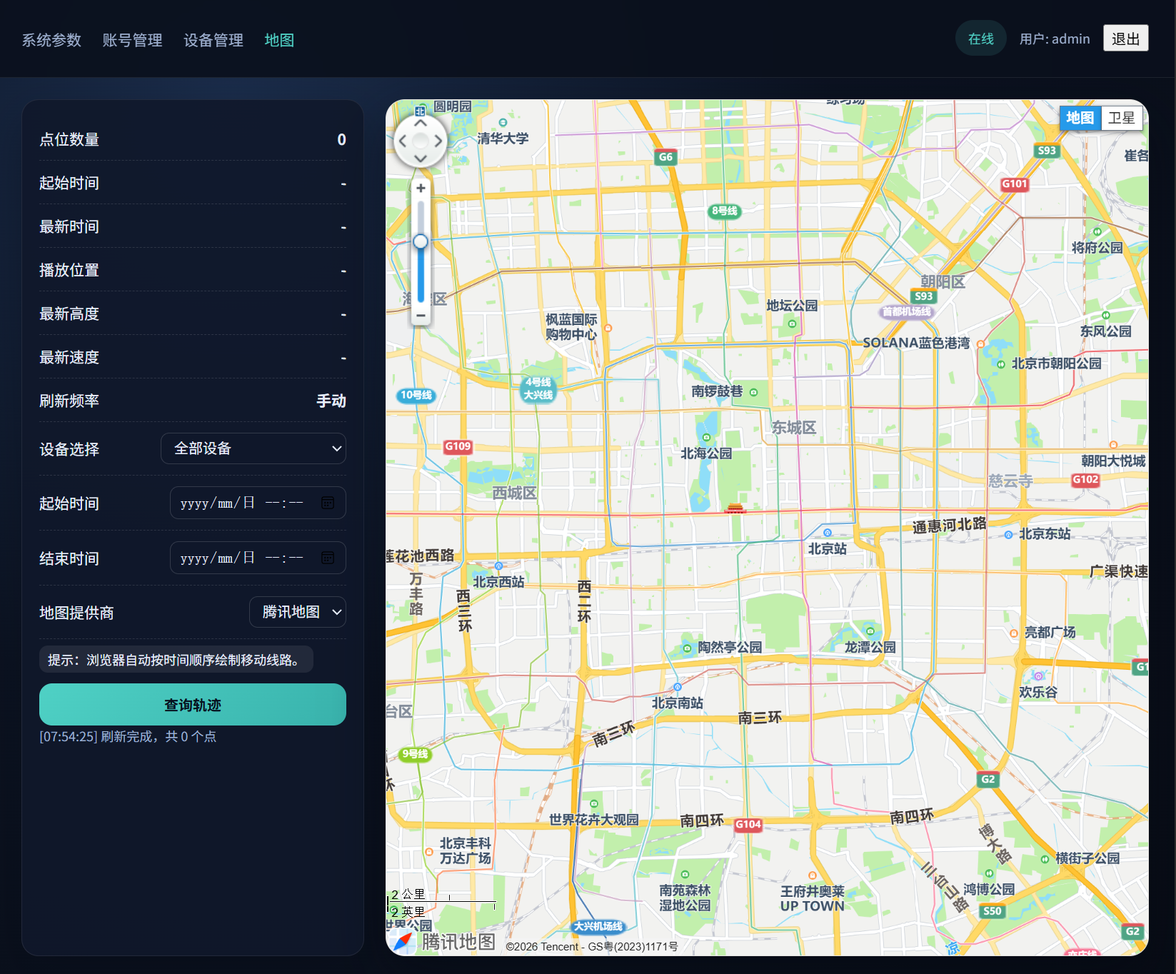 登录后在在导航栏有,【系统参数】【账号管理】【设备管理】【地图】