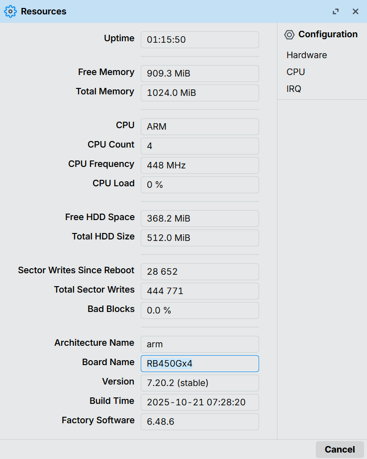 RB450Gx4有512MB的ROM硬盘空间,RAM有1GB,CPU是IPQ4018 880MHz,能正常运行Shallow API,
