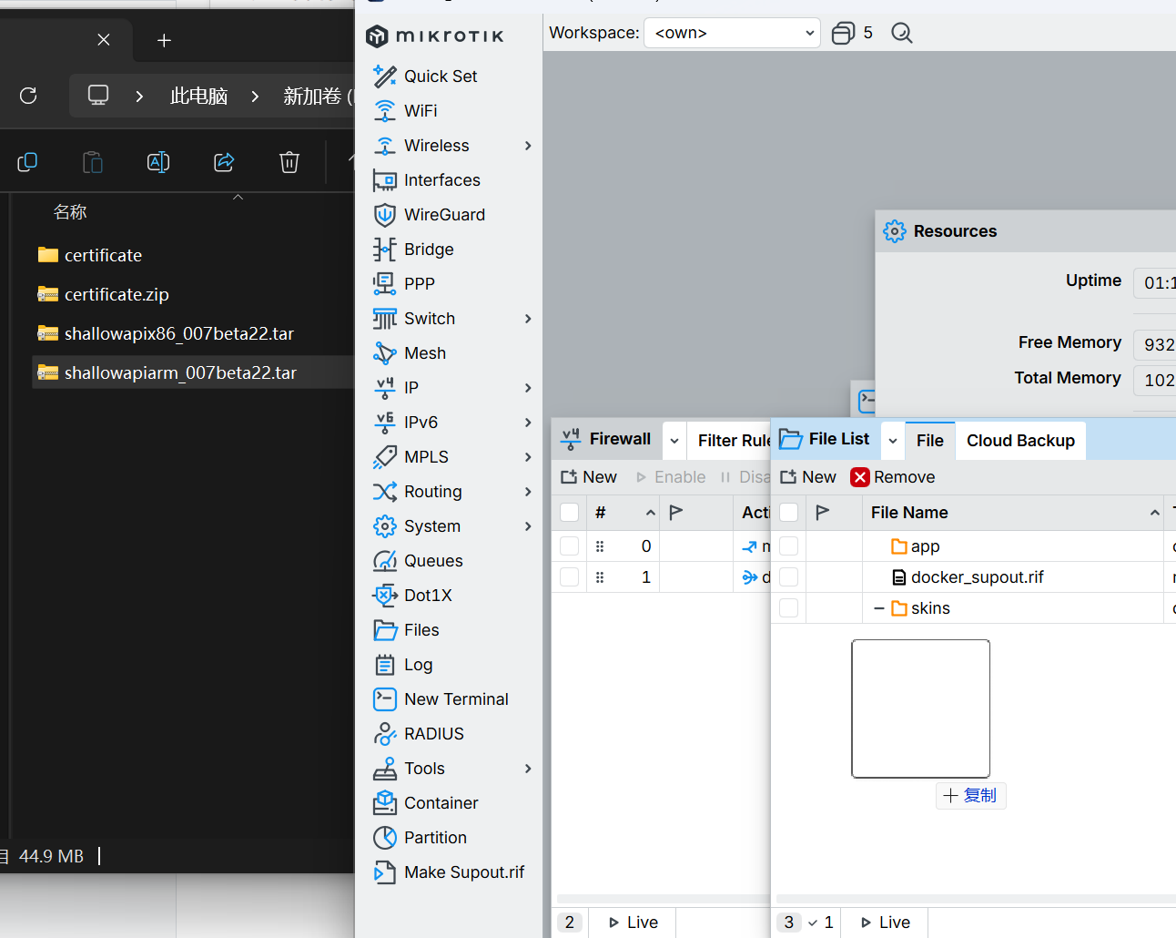 上传Docker的tar镜像文件,打开Winbox 4,将镜像文件拖到到File的根目录下