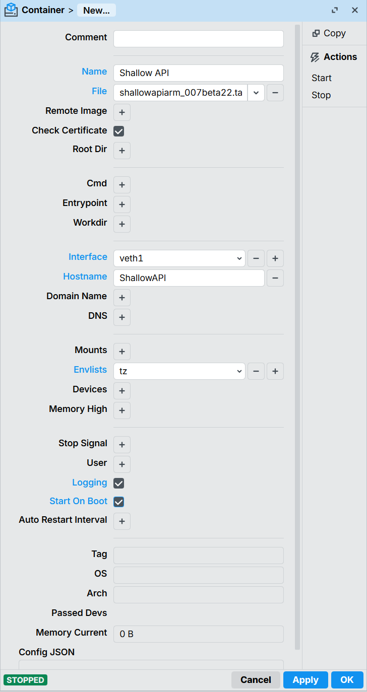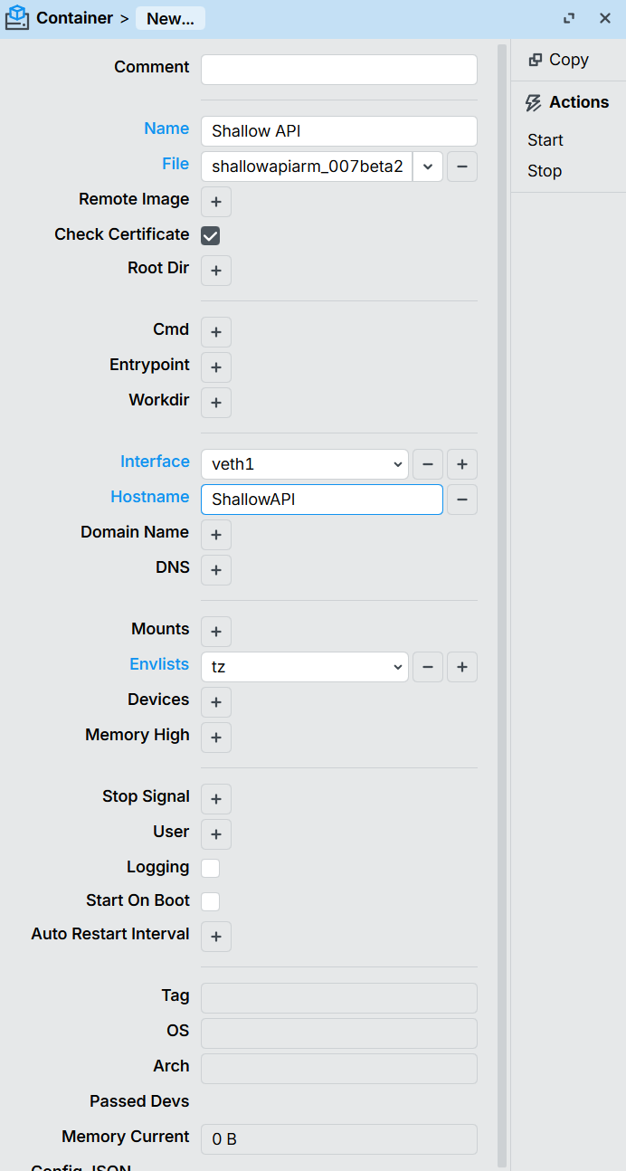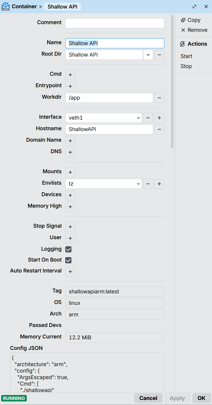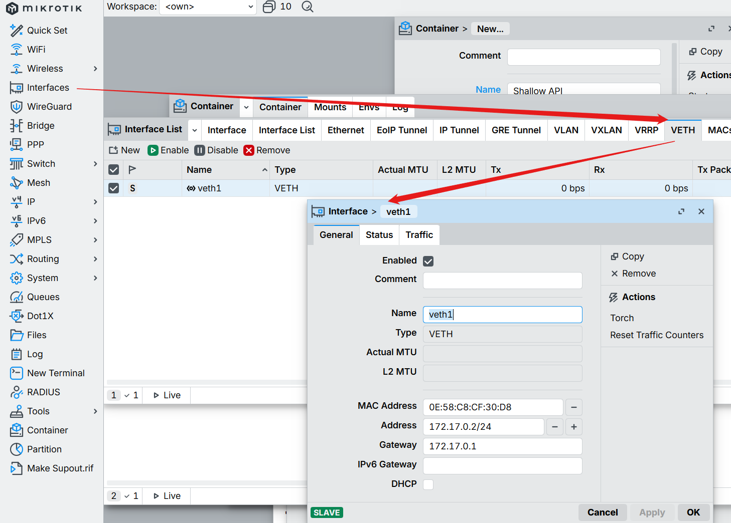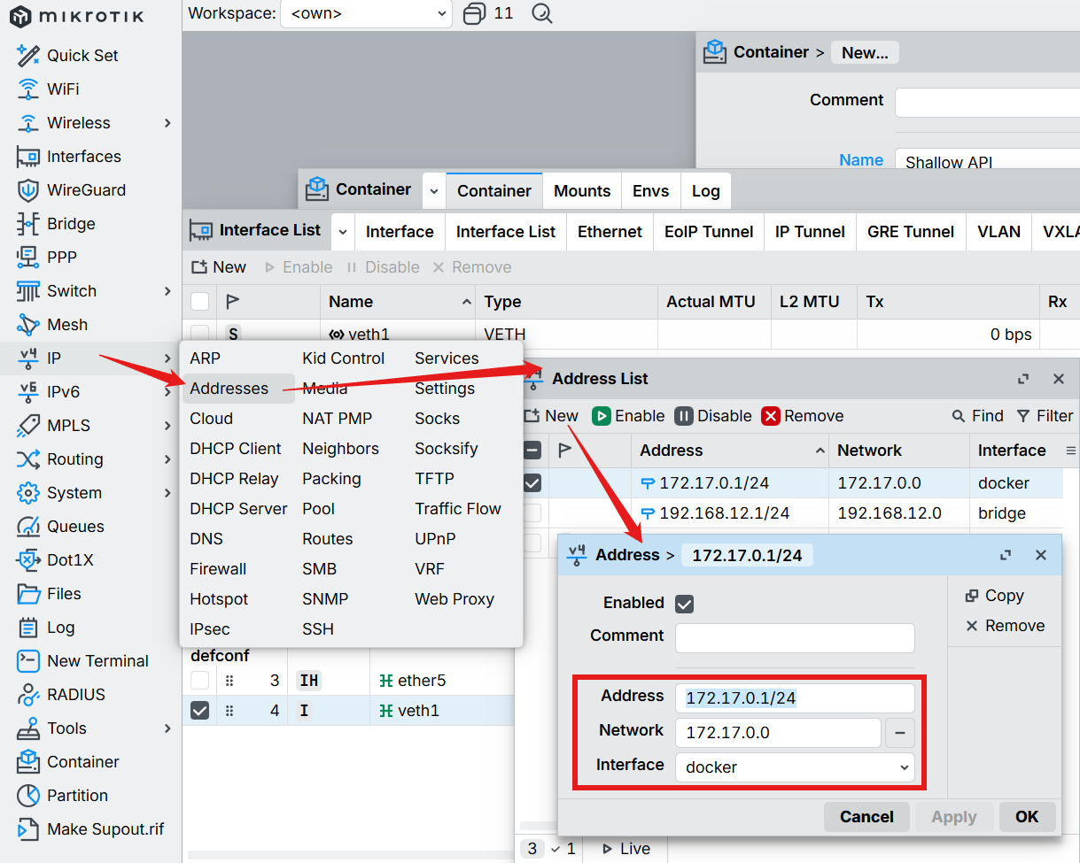 RB450Gx4作为网关,内网地址段是192.168.12.1/24,内网用户地址段是192.168.12.0/24,Shallow API容器配置172.17.0.2/24的IP地址